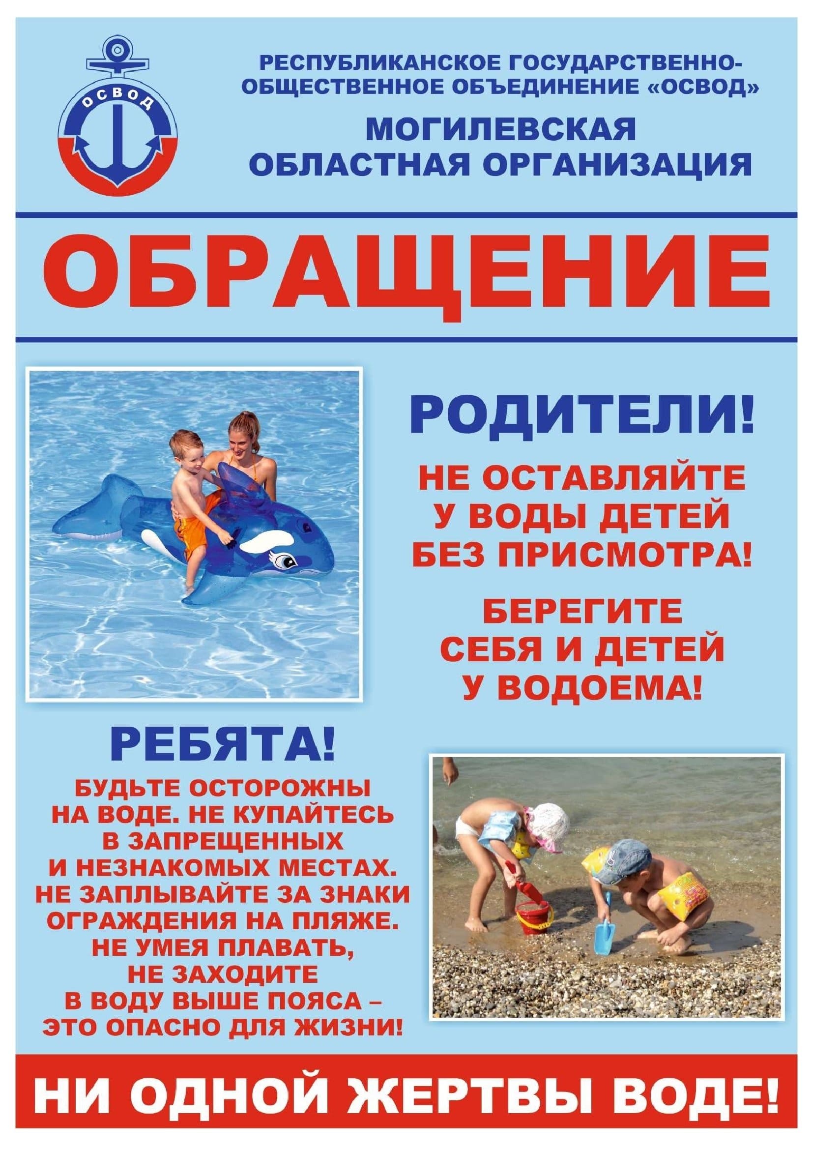 Уважаемые родители! Наблюдайте за своими детьми, когда они играют на берегу, не выпускайте их из виду. Не позволяйте детям нырять с ограждений или берега и старайтесь пресекать шалости на воде. Предупредите, что плавать можно только в специально оборудованных местах, недалеко от берега. Объясните ребенку, что не стоит хвастаться перед друзьями умением плавать и устраивать соревнования. Малышей одних в воду отпускать категорически нельзя.